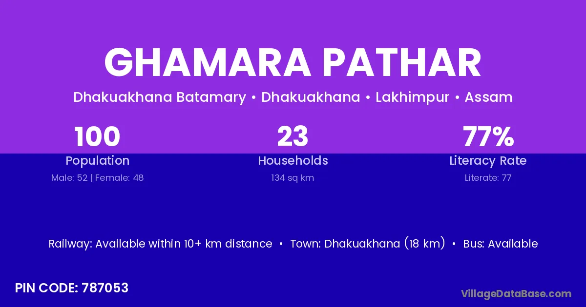 Dhakuakhana (18 km) is the nearest town to Ghamara Pathar village for major economic activities and is located approximately 18 km away.