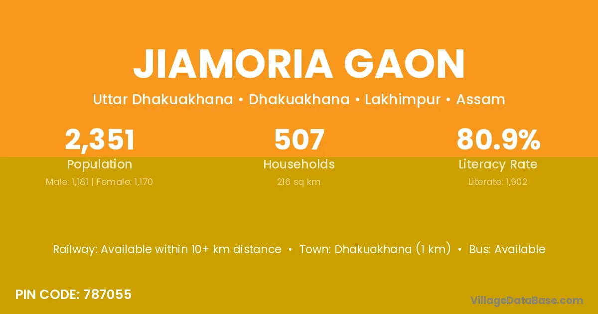 Dhakuakhana (1 km) is the nearest town to Jiamoria Gaon village for major economic activities and is located approximately 1 km away.
