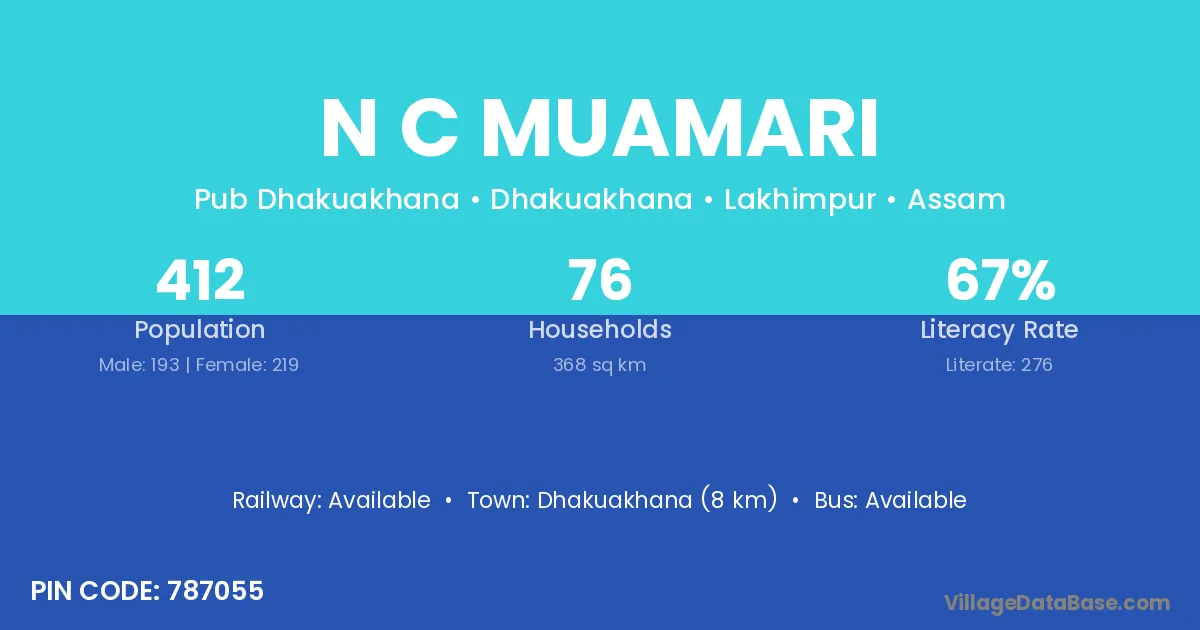 Dhakuakhana (8 km) is the nearest town to N C Muamari village for major economic activities and is located approximately 8 km away.