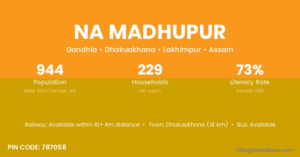 Dhakuakhana (18 km) is the nearest town to Na Madhupur village for major economic activities and is located approximately 18 km away.