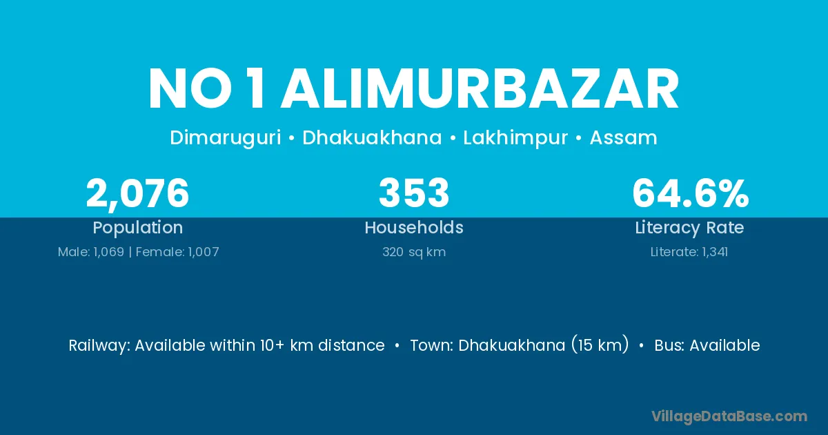 Dhakuakhana (15 km) is the nearest town to No 1 Alimurbazar village for major economic activities and is located approximately 15 km away.