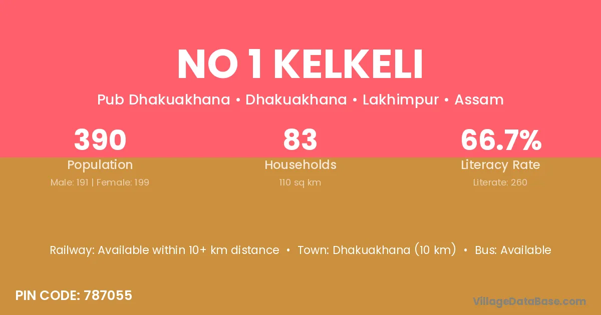 Dhakuakhana (10 km) is the nearest town to No 1 Kelkeli village for major economic activities and is located approximately 10 km away.