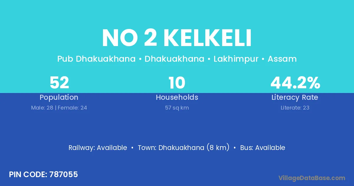 Dhakuakhana (8 km) is the nearest town to No 2 Kelkeli village for major economic activities and is located approximately 8 km away.