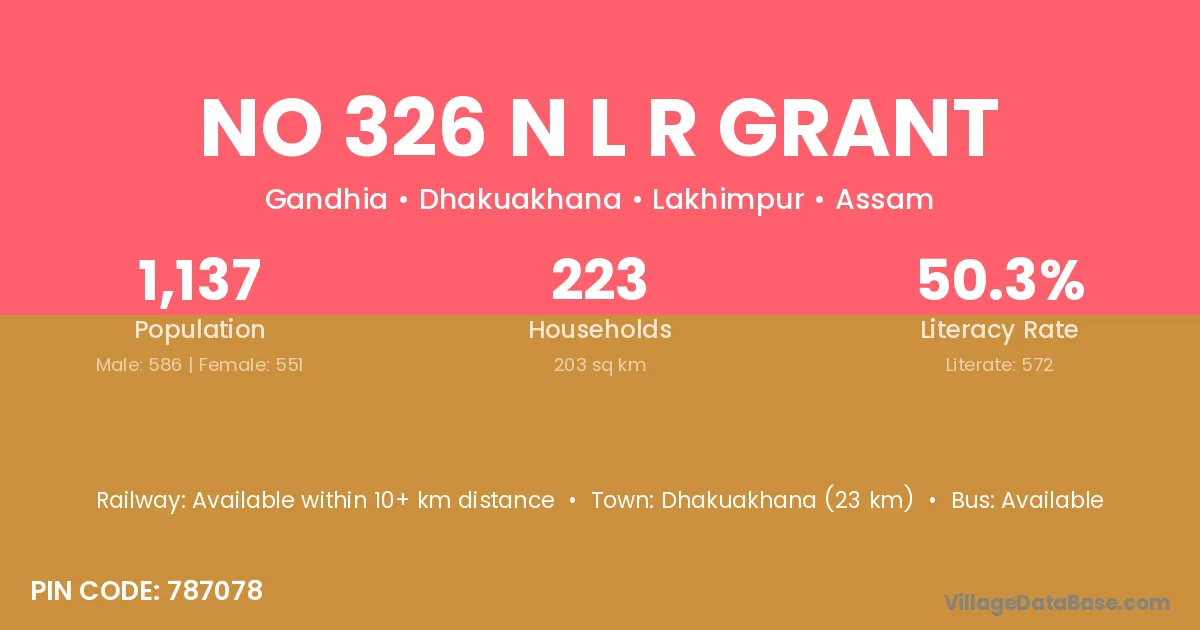 Dhakuakhana (23 km) is the nearest town to No 326 N L R Grant village for major economic activities and is located approximately 23 km away.