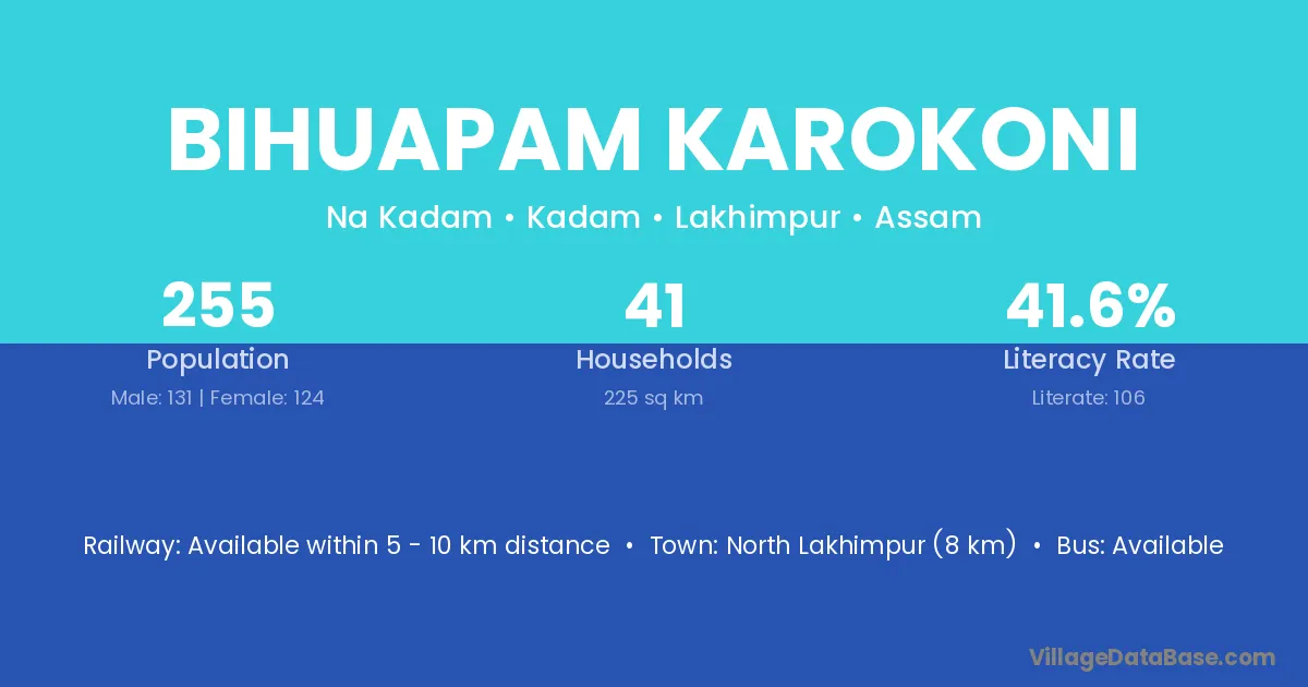 North Lakhimpur (8 km) is the nearest town to Bihuapam Karokoni village for major economic activities and is located approximately 8 km away.