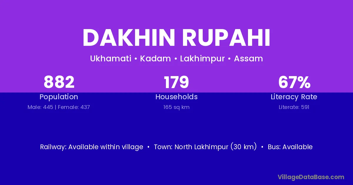North Lakhimpur (30 km) is the nearest town to Dakhin Rupahi village for major economic activities and is located approximately 30 km away.