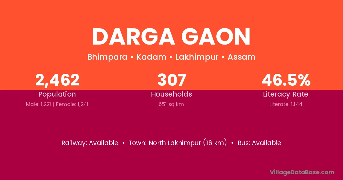 North Lakhimpur (16 km) is the nearest town to Darga Gaon village for major economic activities and is located approximately 16 km away.