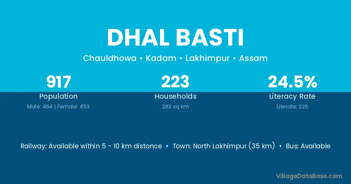 North Lakhimpur (35 km) is the nearest town to Dhal Basti village for major economic activities and is located approximately 35 km away.