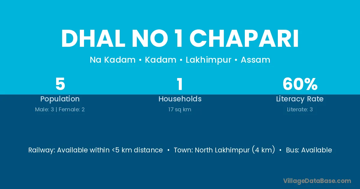 North Lakhimpur (4 km) is the nearest town to Dhal No 1 Chapari village for major economic activities and is located approximately 4 km away.