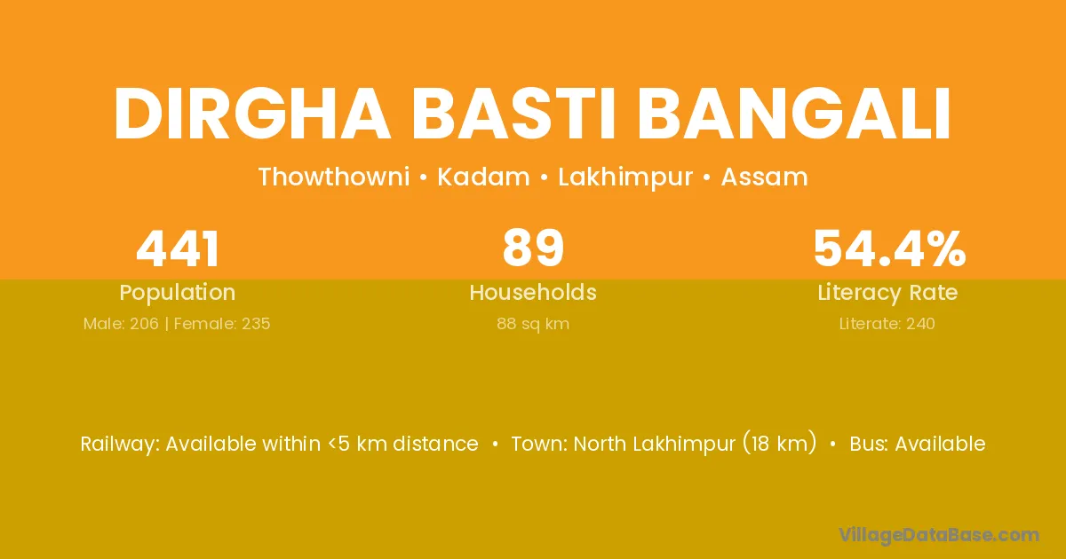 North Lakhimpur (18 km) is the nearest town to Dirgha Basti Bangali village for major economic activities and is located approximately 18 km away.