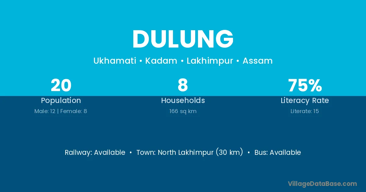 North Lakhimpur (30 km) is the nearest town to Dulung village for major economic activities and is located approximately 30 km away.
