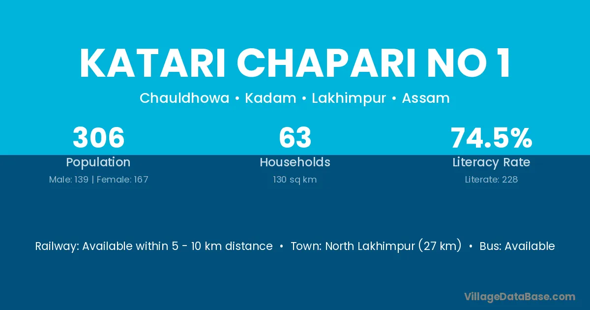 North Lakhimpur (27 km) is the nearest town to Katari Chapari No 1 village for major economic activities and is located approximately 27 km away.