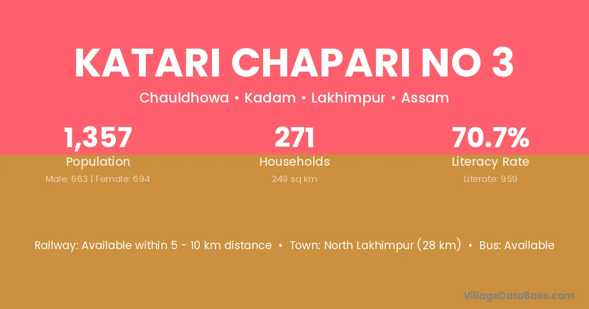North Lakhimpur (28 km) is the nearest town to Katari Chapari No 3 village for major economic activities and is located approximately 28 km away.