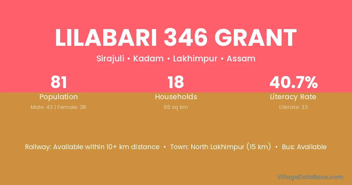 Lilabari 346 Grant village has a total population of 81 people, of which 43 are males and 38 are females.