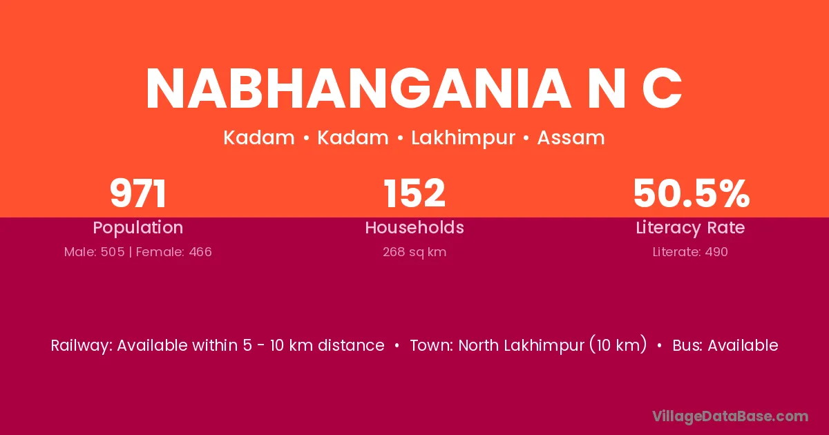 North Lakhimpur (10 km) is the nearest town to Nabhangania N C village for major economic activities and is located approximately 10 km away.