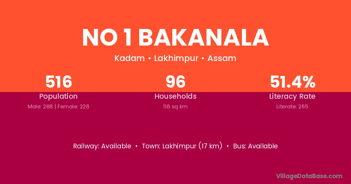 Lakhimpur (17 km) is the nearest town to No 1 Bakanala village for major economic activities and is located approximately 17 km away.