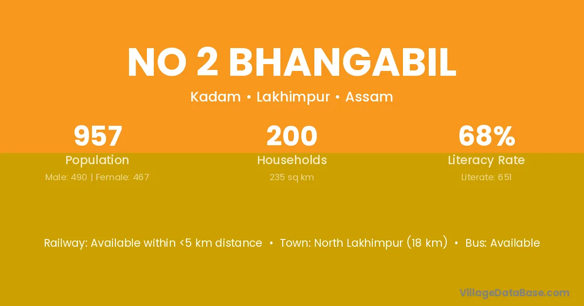North Lakhimpur (18 km) is the nearest town to No 2 Bhangabil village for major economic activities and is located approximately 18 km away.