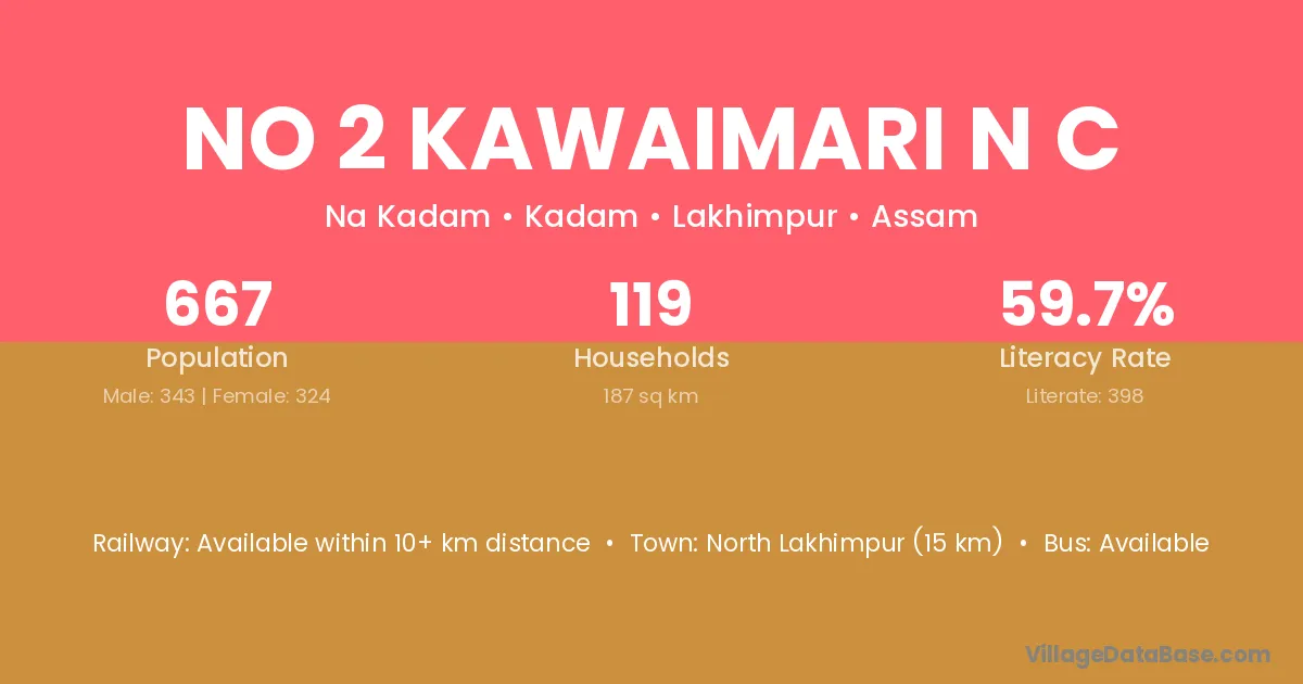 North Lakhimpur (15 km) is the nearest town to No 2 Kawaimari N C village for major economic activities and is located approximately 15 km away.