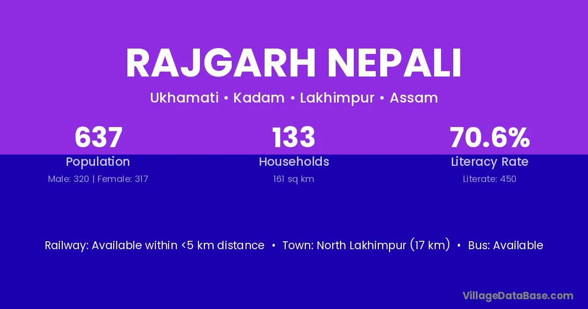 North Lakhimpur (17 km) is the nearest town to Rajgarh Nepali village for major economic activities and is located approximately 17 km away.