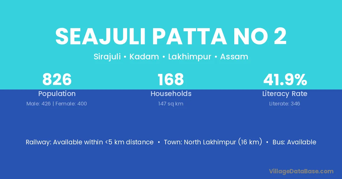North Lakhimpur (16 km) is the nearest town to Seajuli Patta No 2 village for major economic activities and is located approximately 16 km away.