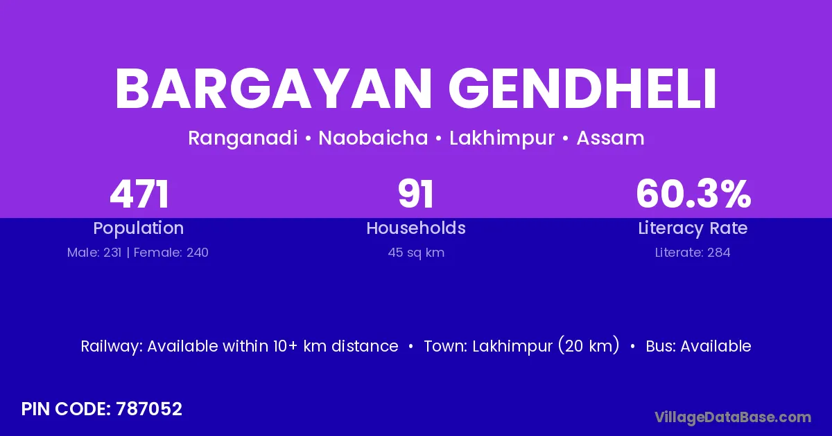 Bargayan Gendheli village has a total population of 471 people, of which 231 are males and 240 are females.