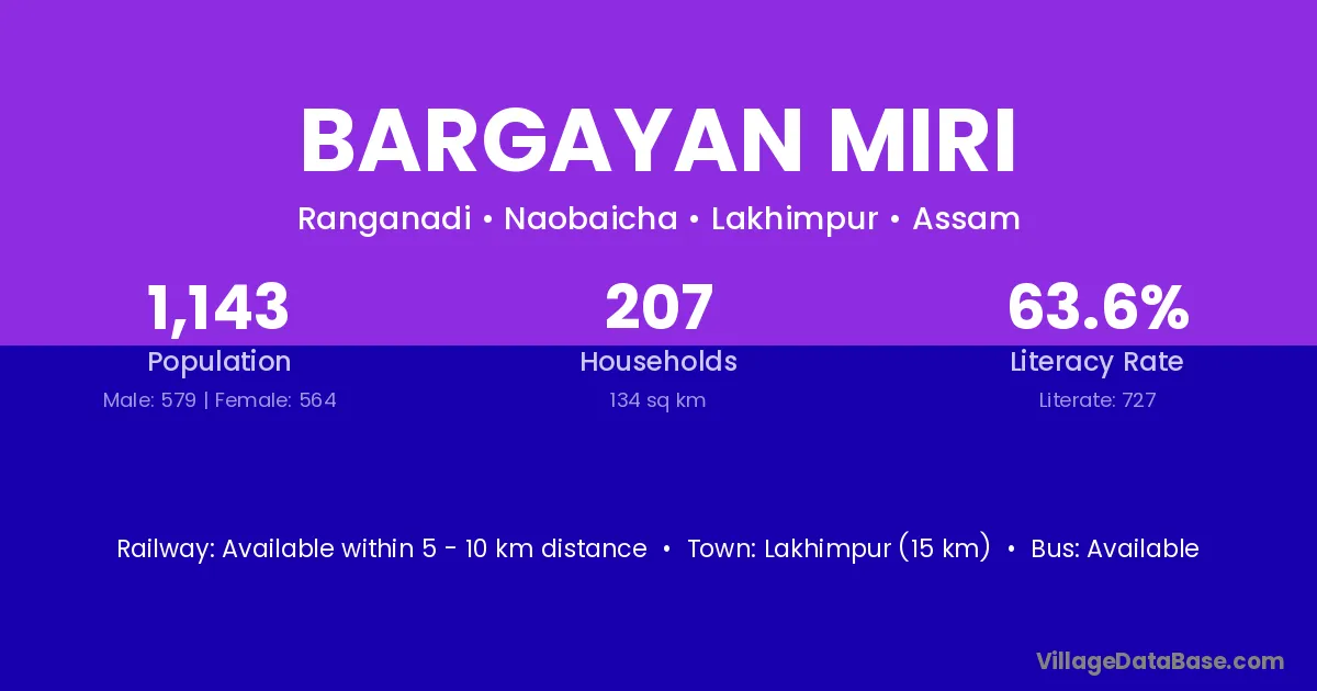 Lakhimpur (15 km) is the nearest town to Bargayan Miri village for major economic activities and is located approximately 15 km away.