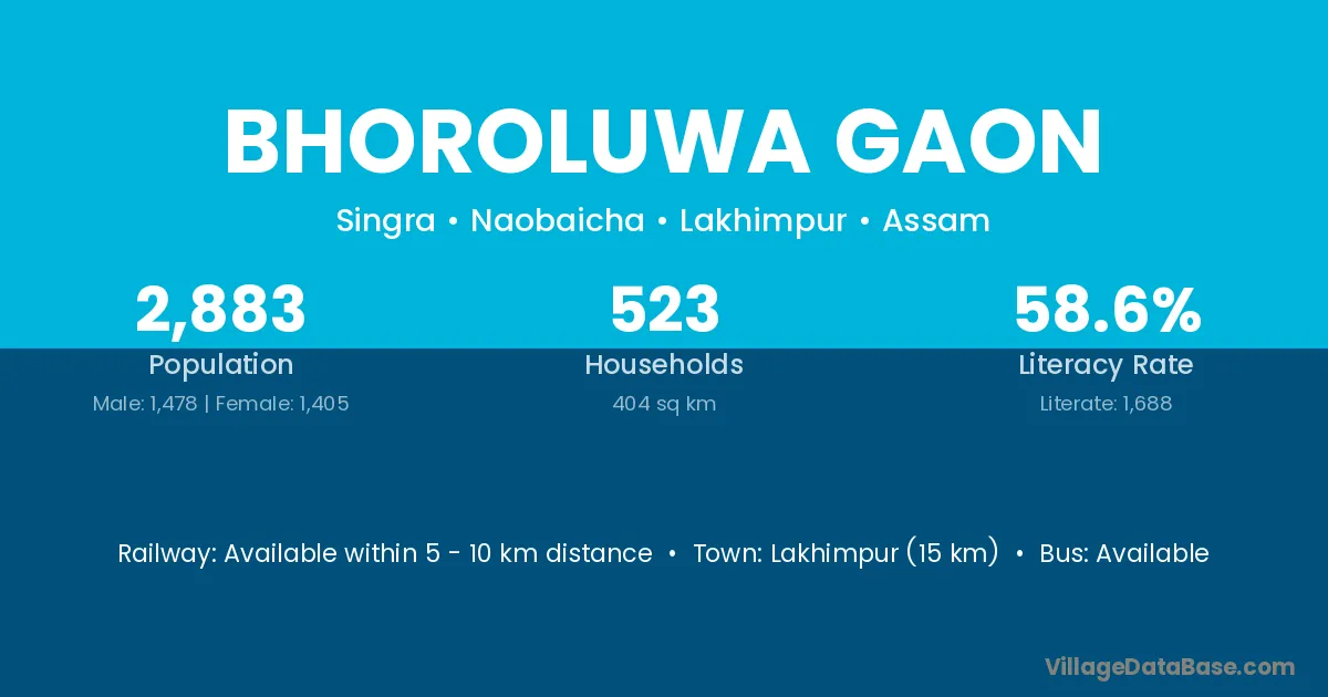 Lakhimpur (15 km) is the nearest town to Bhoroluwa Gaon village for major economic activities and is located approximately 15 km away.