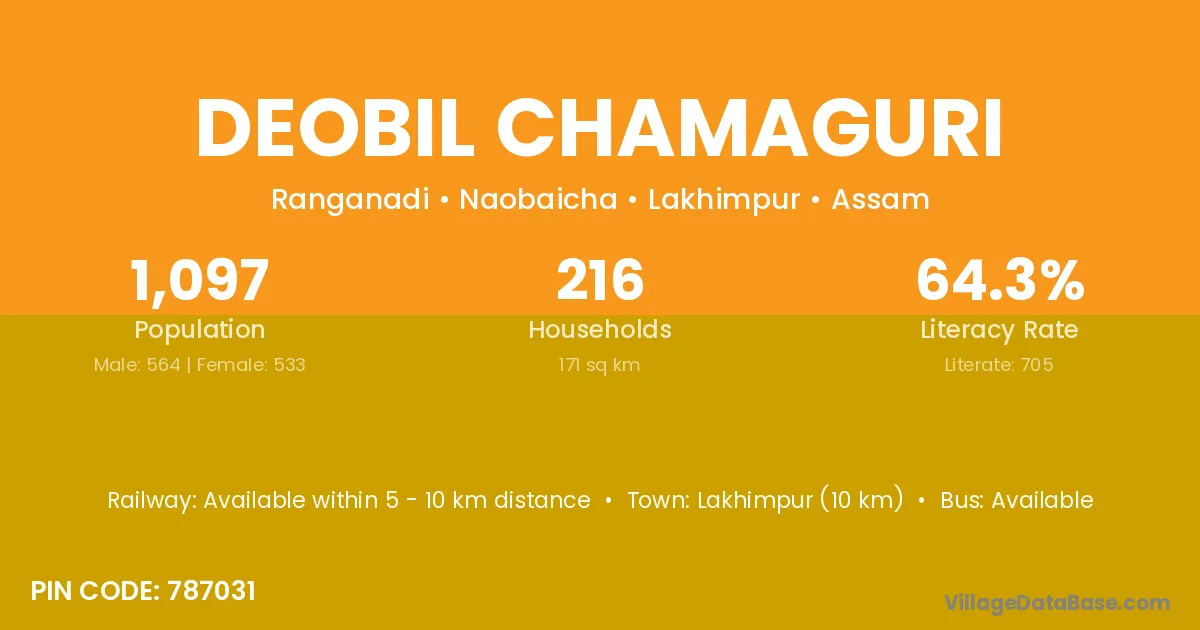 Lakhimpur (10 km) is the nearest town to Deobil Chamaguri village for major economic activities and is located approximately 10 km away.