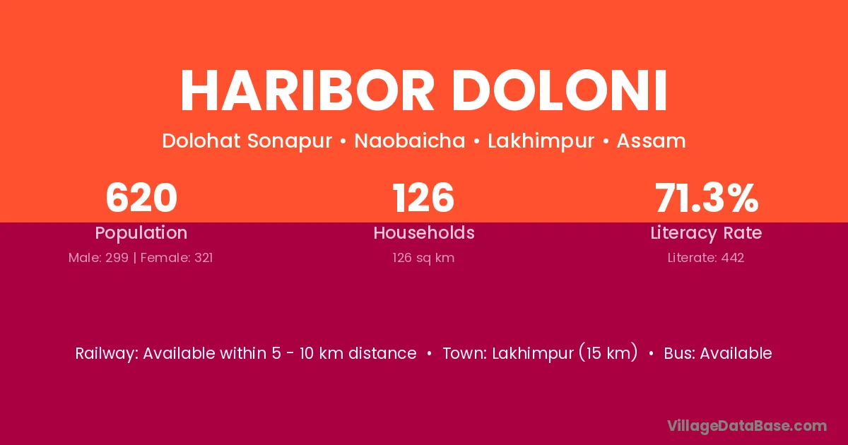 Lakhimpur (15 km) is the nearest town to Haribor Doloni village for major economic activities and is located approximately 15 km away.