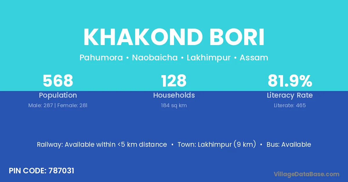 Lakhimpur (9 km) is the nearest town to Khakond Bori village for major economic activities and is located approximately 9 km away.