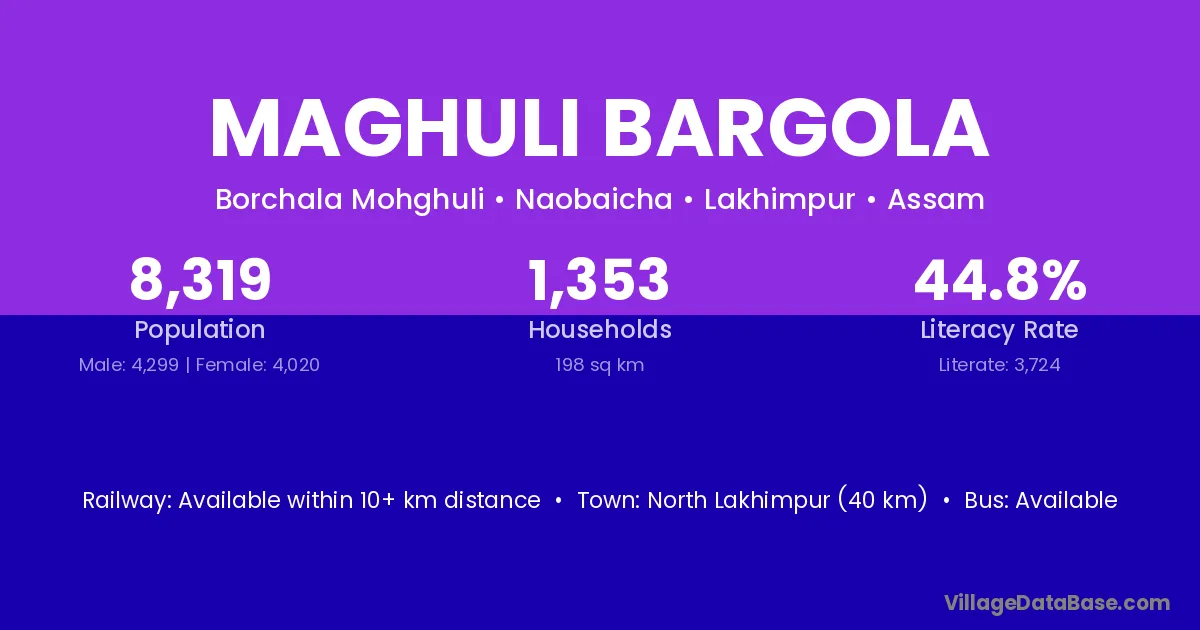 North Lakhimpur (40 km) is the nearest town to Maghuli Bargola village for major economic activities and is located approximately 40 km away.
