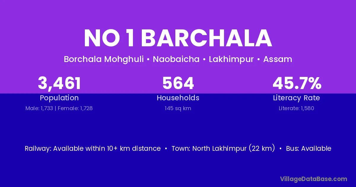 North Lakhimpur (22 km) is the nearest town to No 1 Barchala village for major economic activities and is located approximately 22 km away.