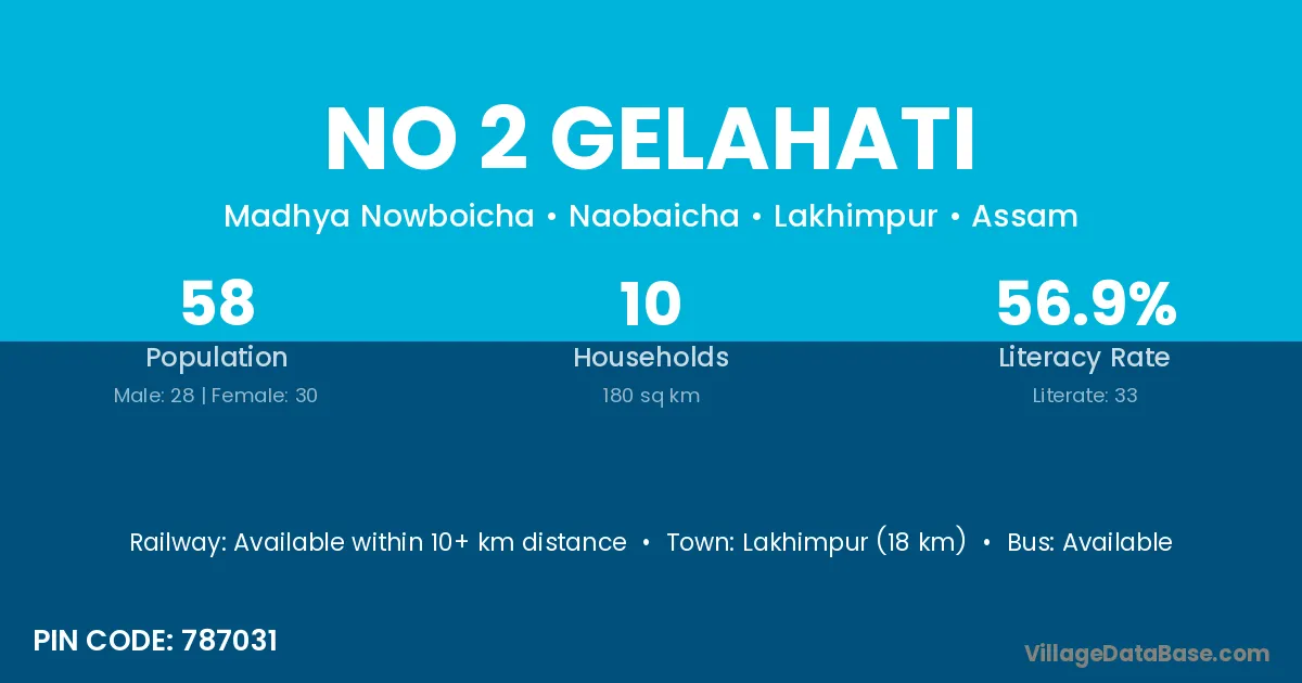 Lakhimpur (18 km) is the nearest town to No 2 Gelahati village for major economic activities and is located approximately 18 km away.