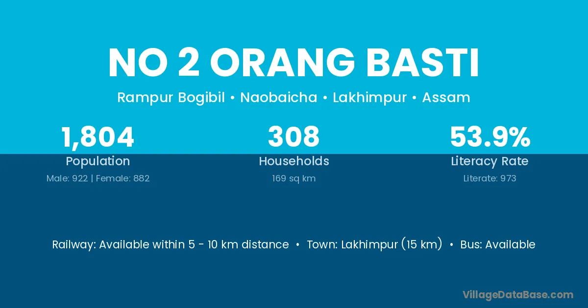Lakhimpur (15 km) is the nearest town to No 2 Orang Basti village for major economic activities and is located approximately 15 km away.