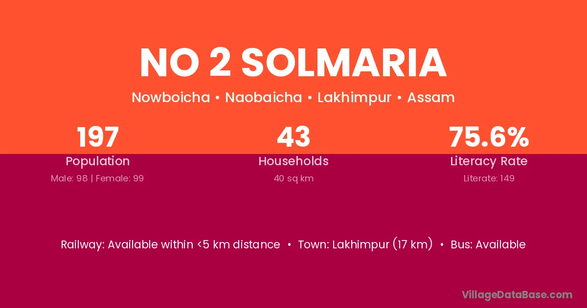 Lakhimpur (17 km) is the nearest town to No 2 Solmaria village for major economic activities and is located approximately 17 km away.