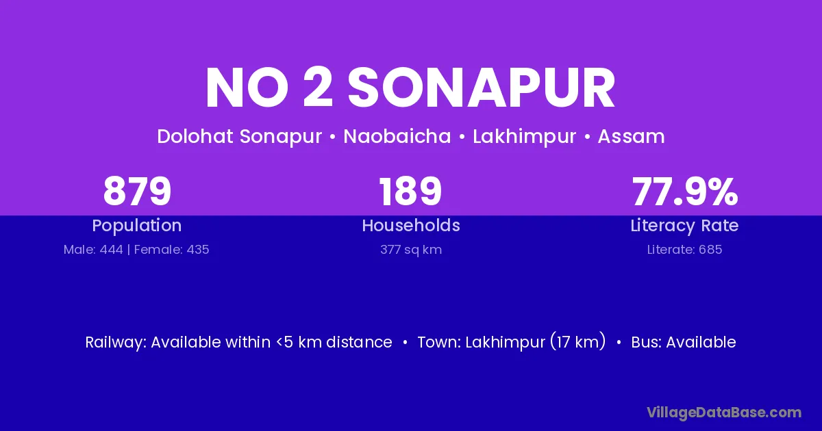 No 2 Sonapur village has a total population of 879 people, of which 444 are males and 435 are females.