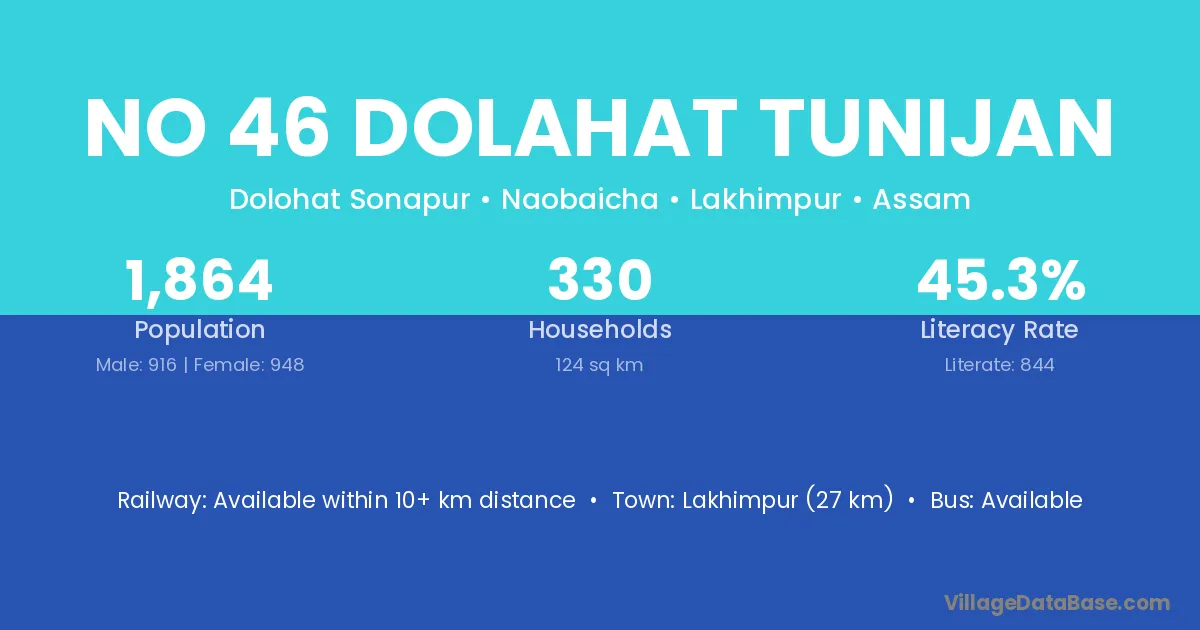 Lakhimpur (27 km) is the nearest town to No 46 Dolahat Tunijan village for major economic activities and is located approximately 27 km away.