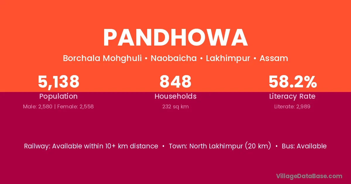 North Lakhimpur (20 km) is the nearest town to Pandhowa village for major economic activities and is located approximately 20 km away.