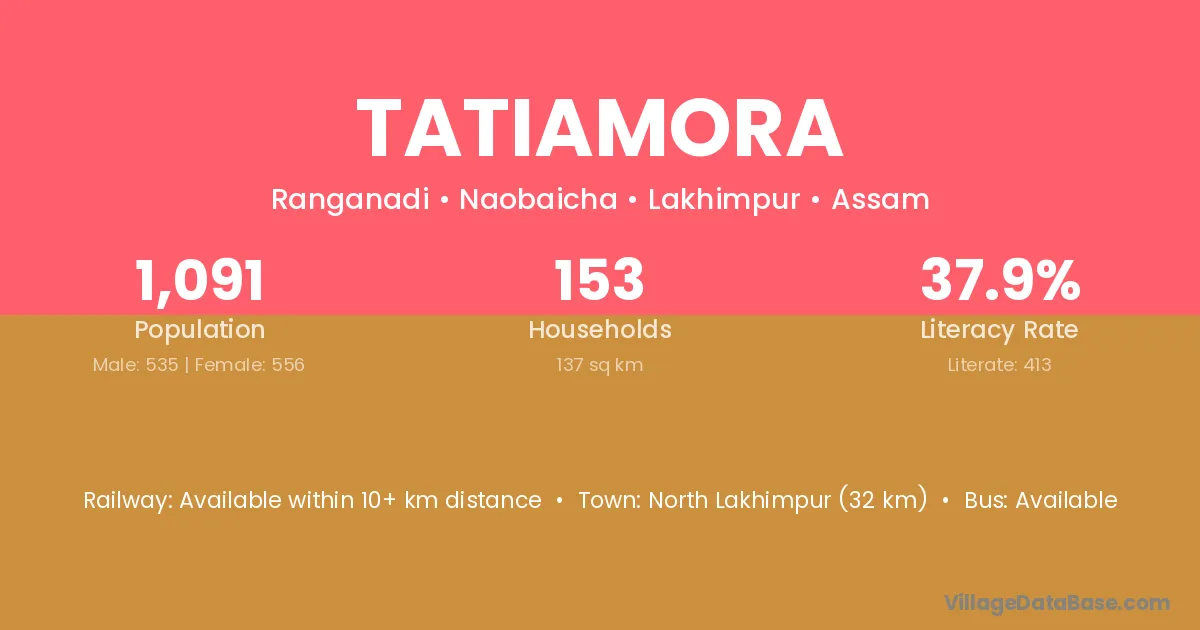 North Lakhimpur (32 km) is the nearest town to Tatiamora village for major economic activities and is located approximately 32 km away.