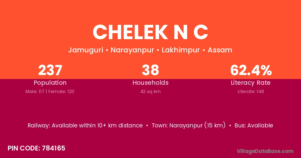 Narayanpur (15 km) is the nearest town to Chelek N C village for major economic activities and is located approximately 15 km away.