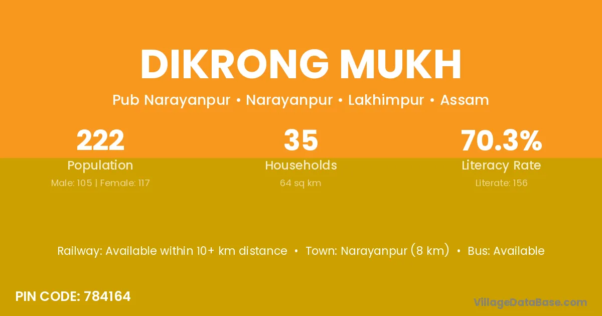 Narayanpur (8 km) is the nearest town to Dikrong Mukh village for major economic activities and is located approximately 8 km away.