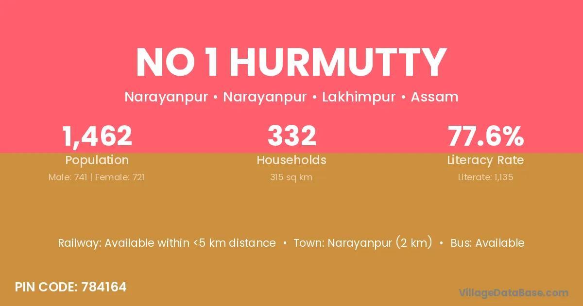 Narayanpur (2 km) is the nearest town to No 1 Hurmutty village for major economic activities and is located approximately 2 km away.