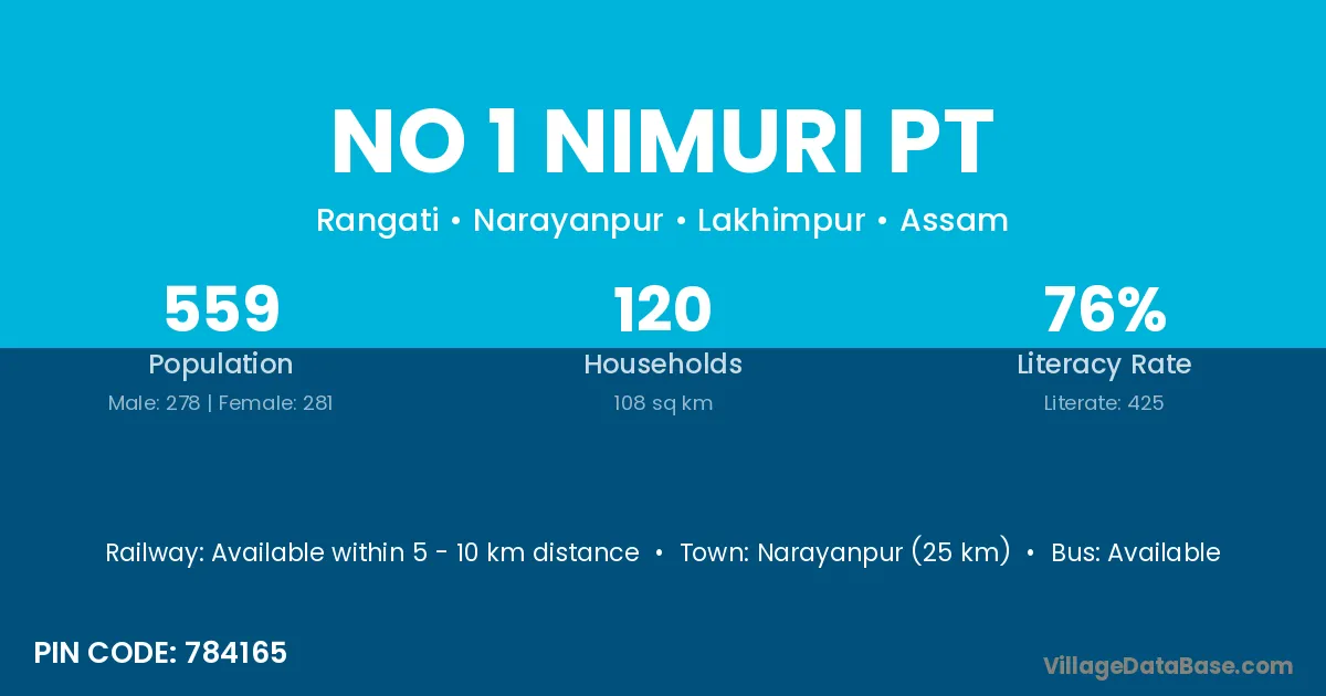 The literacy rate of No 1 Nimuri Pt village is 76.03%. Male literacy stands at 82.73% and female literacy at 69.40%.