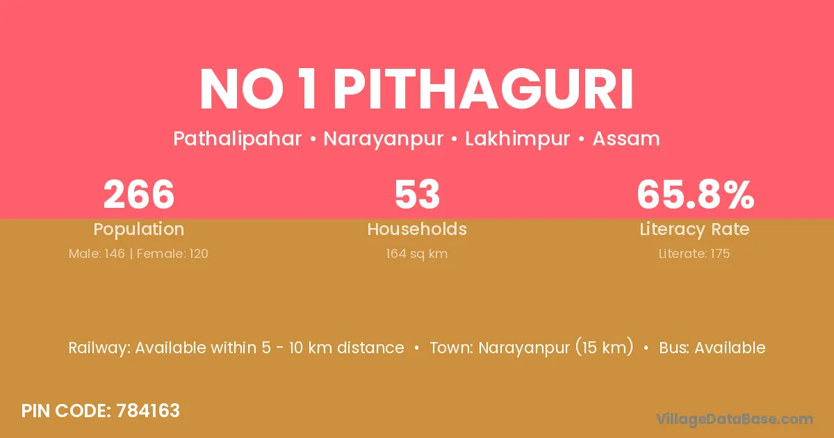 No 1 Pithaguri village has a total population of 266 people, of which 146 are males and 120 are females.