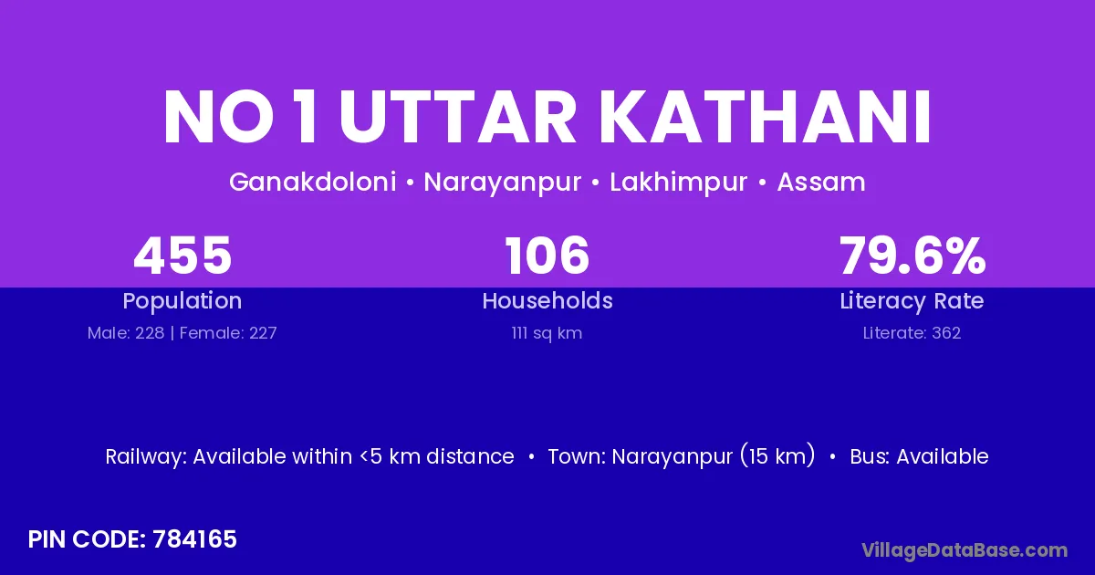 No 1 Uttar Kathani village has a total population of 455 people, of which 228 are males and 227 are females.