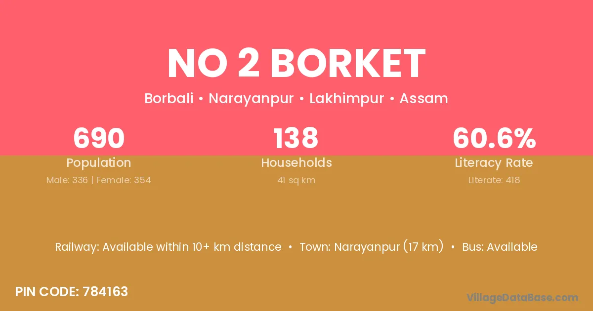 No 2 Borket village has a total population of 690 people, of which 336 are males and 354 are females.