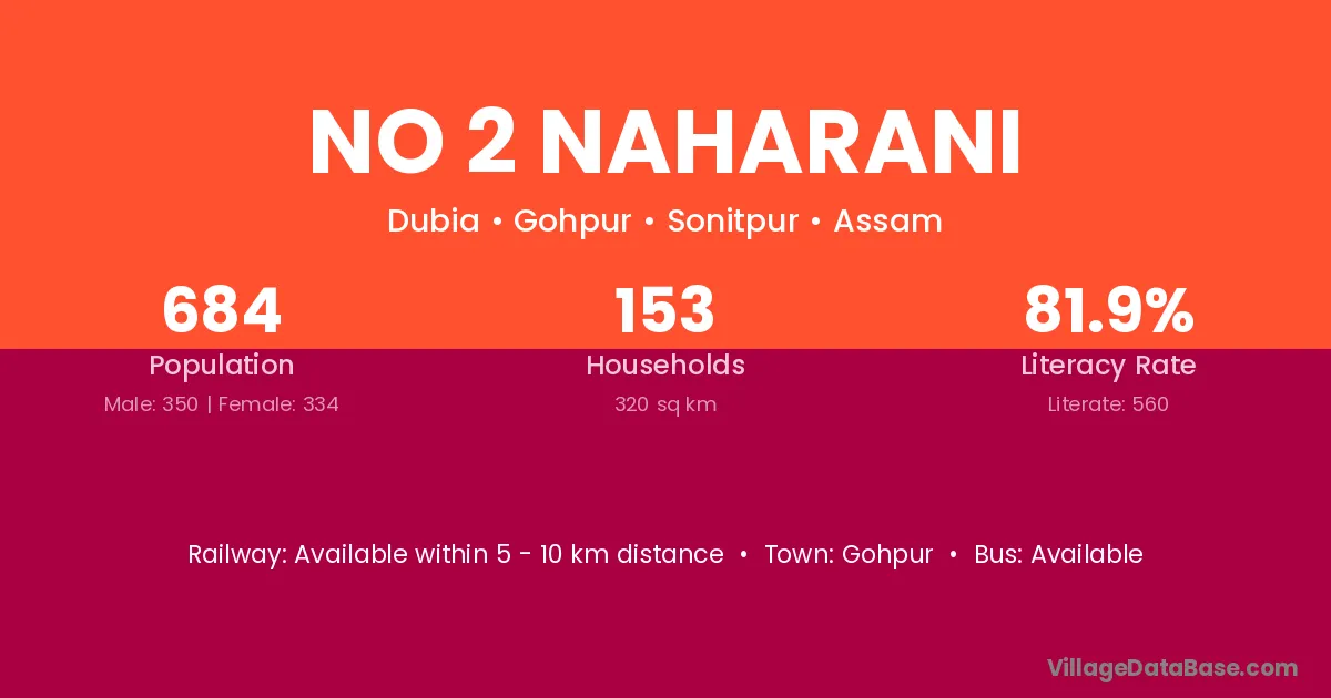 No 2 Naharani village has a total population of 482 people, of which 231 are males and 251 are females.