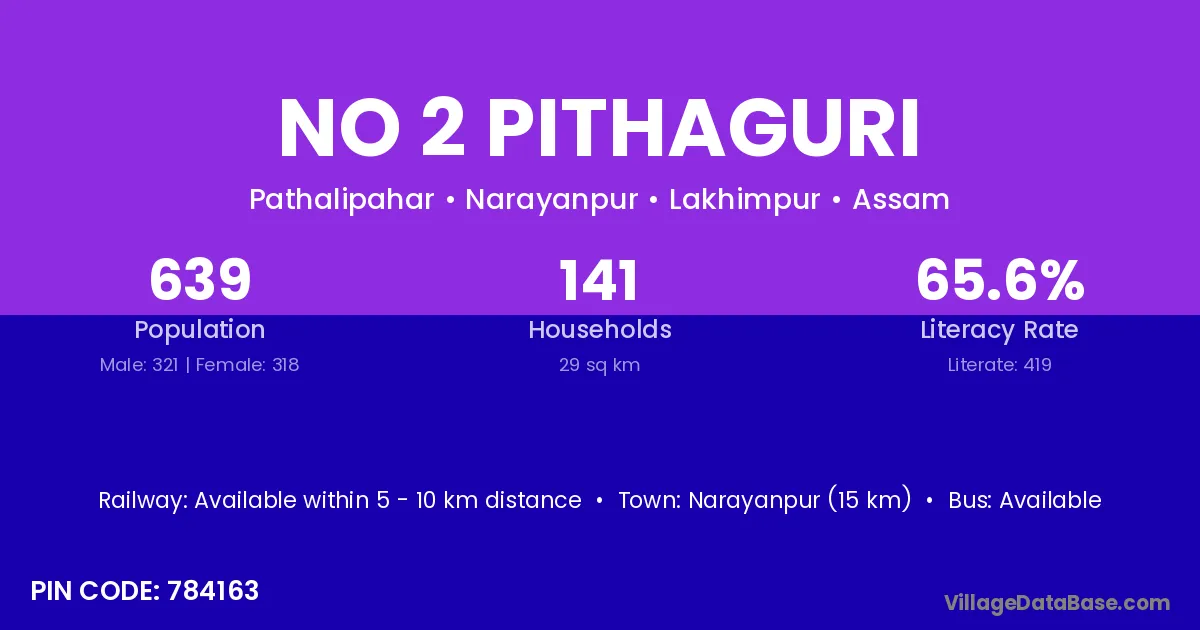 No 2 Pithaguri village has a total population of 639 people, of which 321 are males and 318 are females.