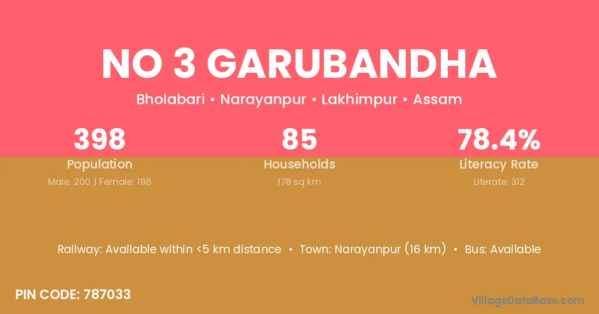 The literacy rate of No 3 Garubandha village is 78.39%. Male literacy stands at 85.00% and female literacy at 71.72%.