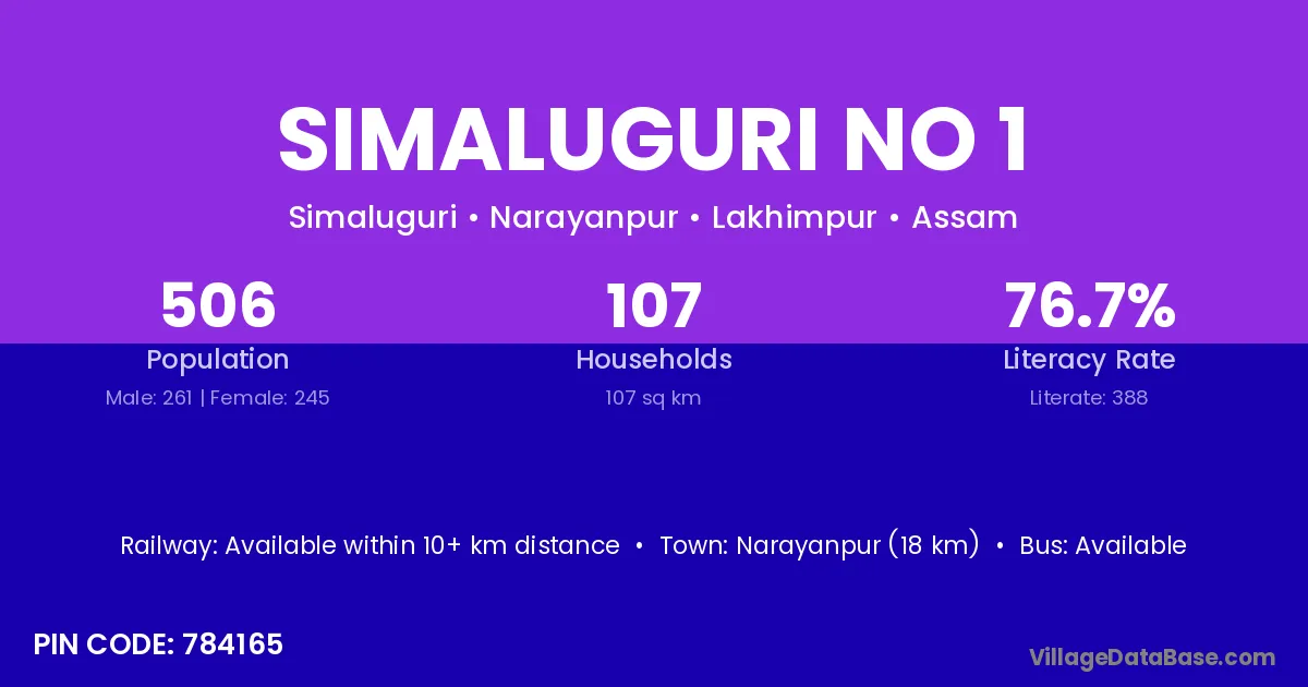 Simaluguri No 1 village has a total population of 506 people, of which 261 are males and 245 are females.
